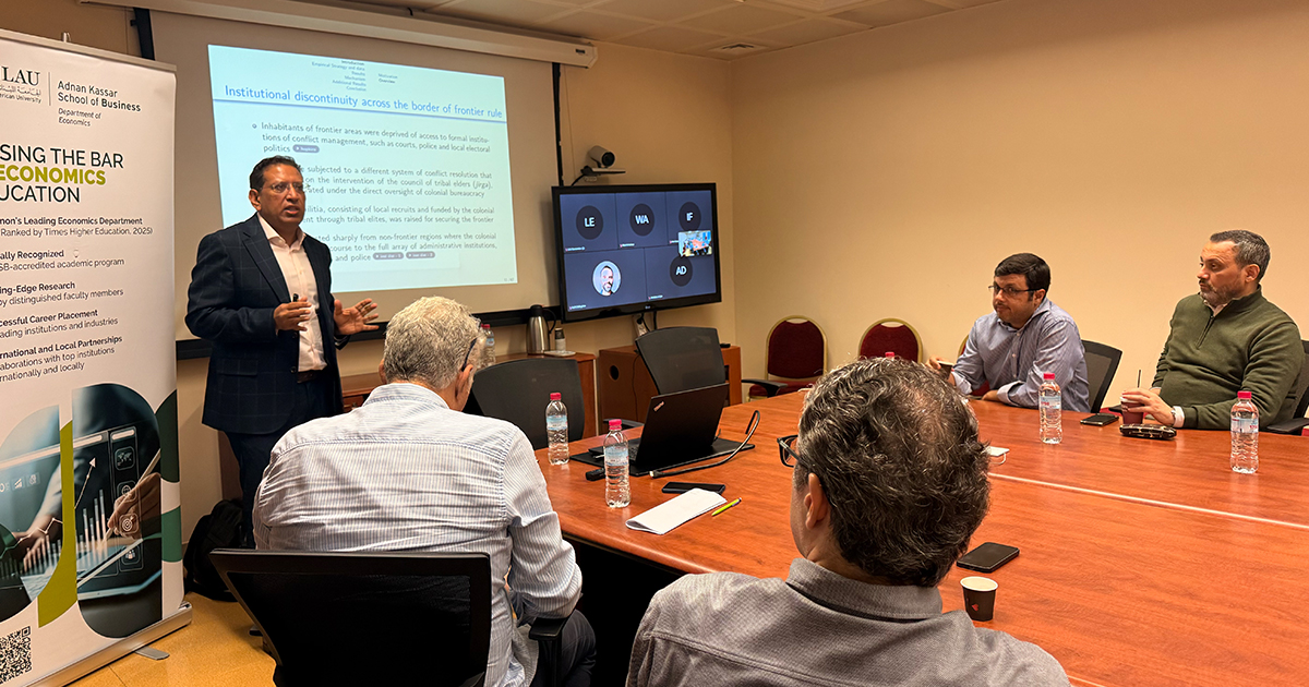 As part of the Beirut Economics Research Seminar Series—co-organized by the LAU Department of Economics and the AUB Department of Economics—LAU hosted Dr. Adeel Malik from the University of Oxford on November 5. His talk, titled “Frontier Rule and Conflict,” explored how governance across contested borders shapes development outcomes. Bringing together students, faculty and researchers, the seminar fostered meaningful academic dialogue and reinforced the series’ role in advancing economics scholarship in Lebanon through institutional collaboration and knowledge exchange.